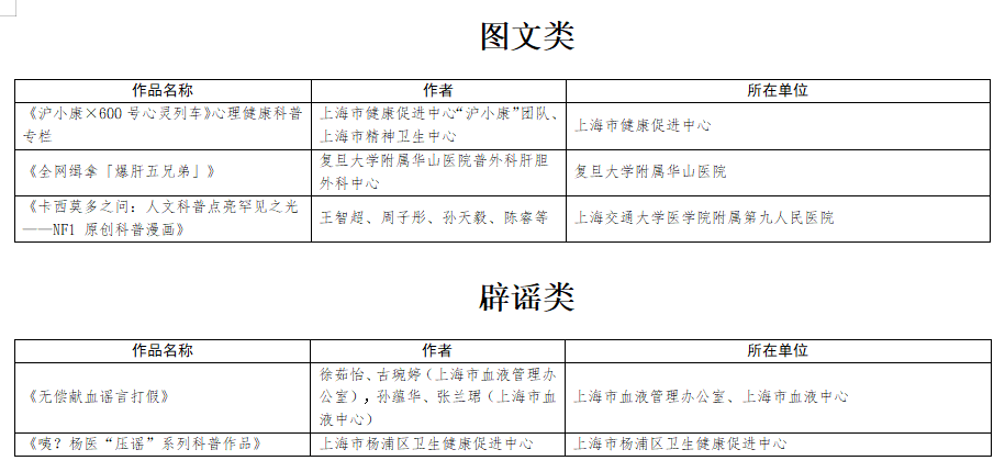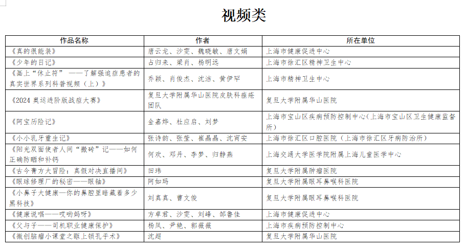 上海市卫生健康委、市爱卫办共同开展上海赛区的征集大赛。本次活动中,上海报送的作品题材广泛、形式多样,紧密贴合公众健康需求,展现了出色的科普创作与传播能力。在视频类获奖作品中,既有聚焦心理健康、呼吁社会理解的徐汇区精神卫生中心《少年的日记》、上海市精神卫生中心《画上“休止符”》,也有生动讲解儿童口腔健康、近视防控、皮肤护理等实用知识的徐汇区口腔医院《小小乳牙重生记》、复旦大学附属眼耳鼻喉科医院《眼球修理厂的秘密》等;复旦大学附属华山医院、肿瘤医院、眼耳鼻喉科医院及上海儿童医学中心等医疗机构贡献了多部专业与趣味兼备的科普短片,体现了“医学科普为民”的深度与温度。图文类作品同样精彩,上海市健康促进中心《沪小康×600号心灵列车》专栏以创新的形式普及心理健康知识,复旦大学附属华山医院《全网缉拿“爆肝五兄弟”》则以生动图文揭示肝脏健康常识,展现科普视觉化表达的吸引力。在辟谣类赛道,上海作品直面公众关切,上海市血液管理办公室、上海市血液中心《无偿献血谣言打假》和杨浦区卫生健康促进中心《咦?杨医“压谣”系列科普作品》以权威、清晰的内容回应误解,传递科学声音,助力构建清朗健康的科普环境。