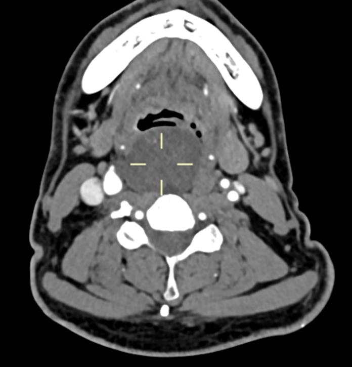 肿块体积大,几乎堵塞喉咽腔,其侧翼更是紧邻颈部大血管。