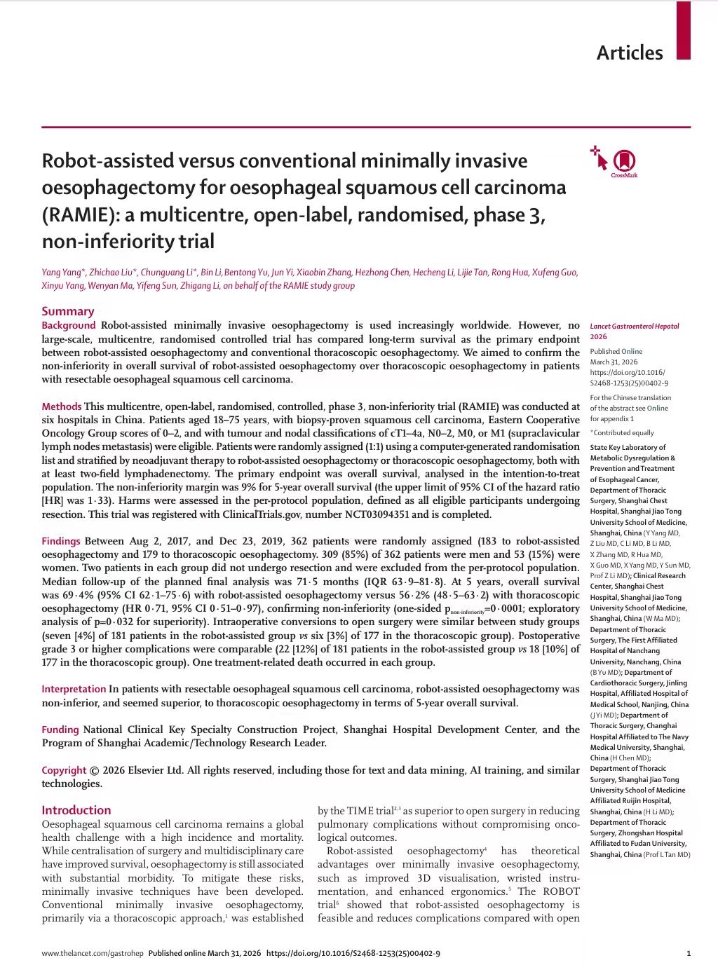 上海市胸科医院胸外科主任李志刚教授团队RAMIE研究成果发表于Lancet Gastroent...