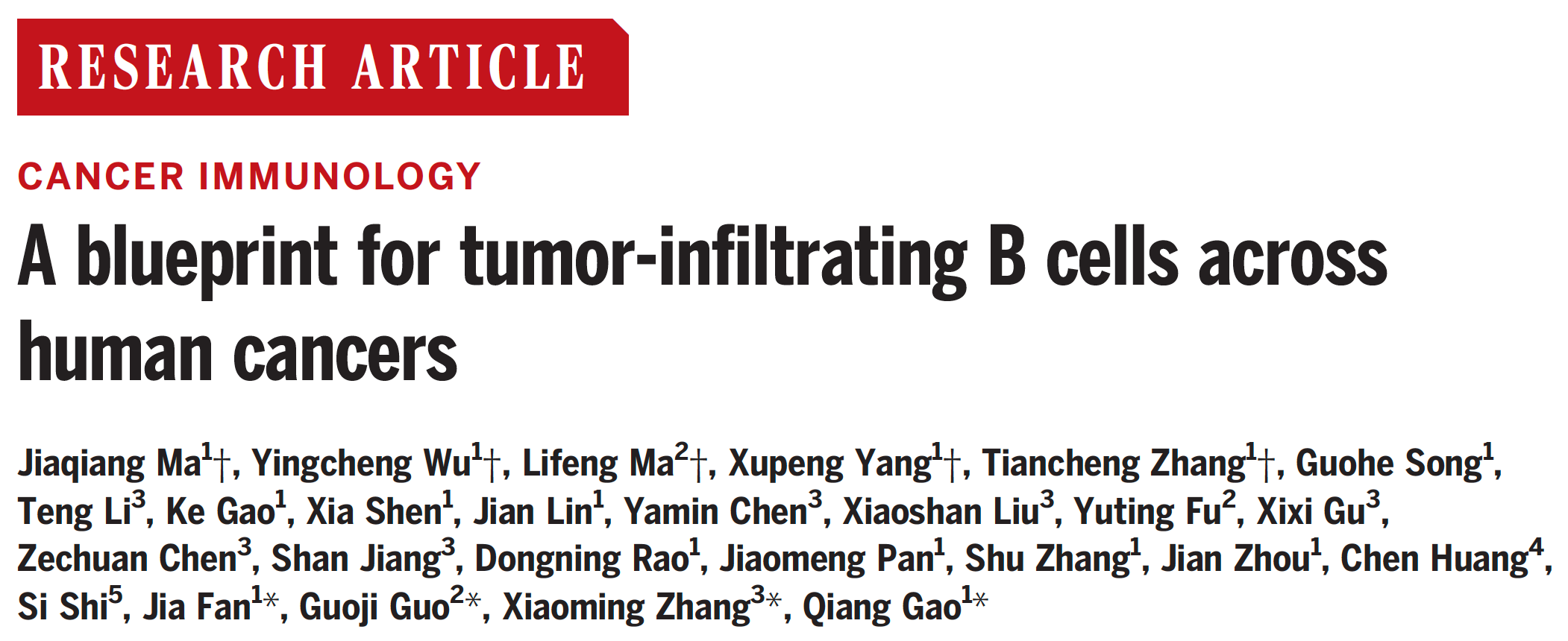 5月3日,复旦大学附属中山医院樊嘉院士、高强教授团队,联合中国科学院上海免疫与感染研究所与浙江大学基础医学院等合作单位,在Science在线发表了题为A blueprint for tumor-infiltrating B cells across human cancers(《人类癌症中肿瘤浸润 B 细胞蓝图》)的论文,系统性揭示了肿瘤微环境B细胞的表型功能异质性、动态分化以及表观调控机制。研究团队分析了肝癌、胆管癌、胆囊癌等多个癌种的临床样本数据发现,B细胞可以分为15个不同功能的亚群。其中,一类叫DUSP4+非典型记忆B细胞的亚群能分泌识别自身抗原的抗体,并抑制T细胞的功能,导致肿瘤微环境处于免疫抑制状态,不利于患者的预后和抗癌免疫治疗。这一发现为未来精准调控B细胞、鉴定新的免疫治疗靶点以及开发新的免疫联合治疗方案提供了重要线索。