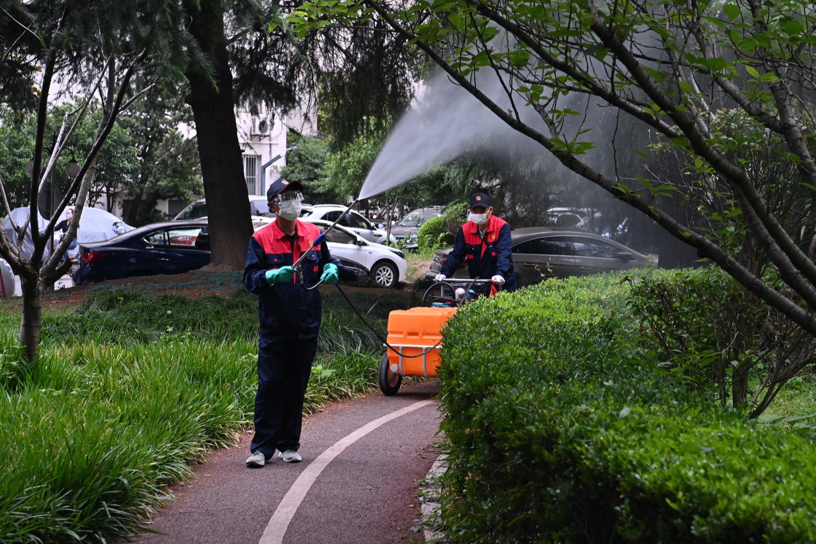 在蚊虫密度高峰季节,每天上午8点-10点和下午3点-6点是白纹伊蚊的活动高峰时间,仙霞爱卫社的17位病媒生物防制员身穿红蓝相间的制服全数出勤,在完善药械检查、做好个人防护后,依次从工具间取出设备,背起各种喷雾器,开始了他们的晨间防蚊灭蚊集中消杀作业,快速灭蚊以降低蚊虫密度。