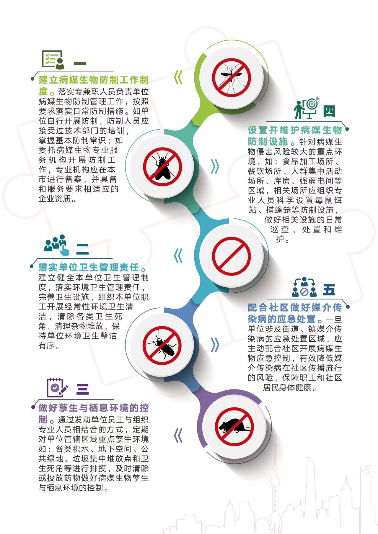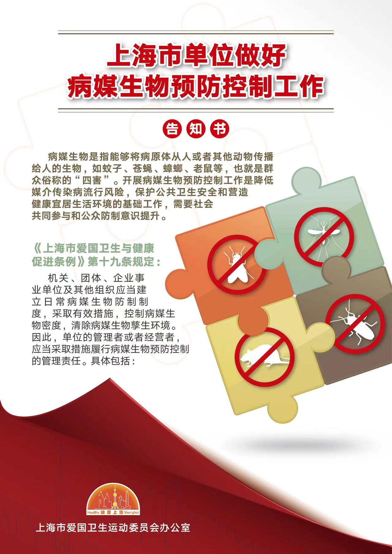 市爱卫办表示,根据《上海市爱国卫生与健康促进条例》,各区各部门以“上海市单位做好病媒生物预防控制工作告知书”的形式,强化单位是病媒生物防制工作的责任主体意识,发动各类单位建立病媒生物预防控制制度,指导单位按照本市统一要求规范落实病媒生物预防控制措施,确保有效控制蚊、蝇、鼠、蟑等病媒生物密度,减少病媒生物孳生和栖息环境。同时呼吁全社会行动起来,坚持抓好以环境治理、灭蚊防病为主的病媒生物综合防制,广泛传播“自己是健康的第一责任人”的理念,全面营造病媒生物防制合力共治的社会氛围,共同打造健康、整洁、绿色、宜居的城市环境。