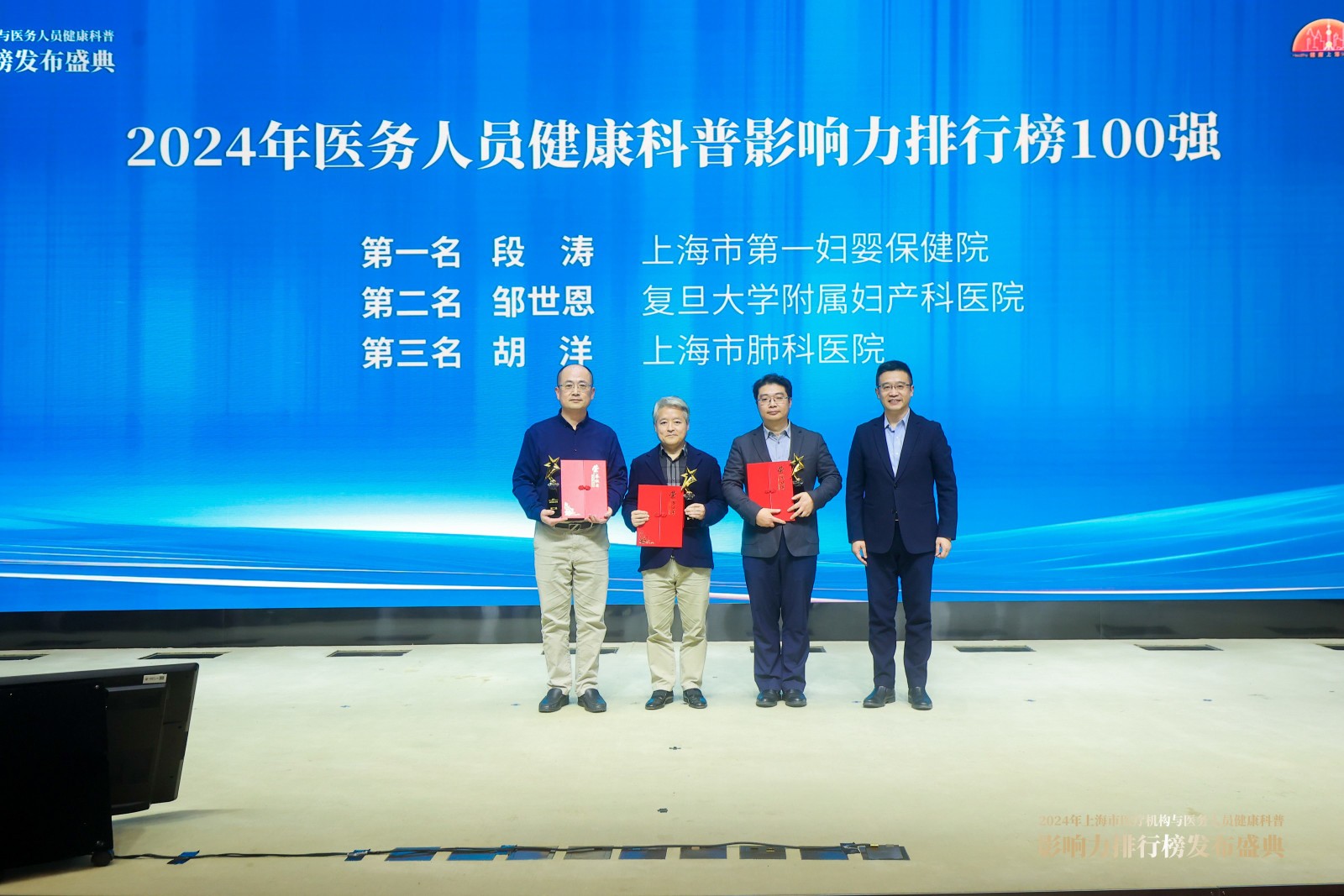 此次最新发布的本市医疗机构与医务人员健康科普影响力排行榜中,上海市第一妇婴保健院、复旦大学附属中山医院、上海市第一人民医院等位列2024年医疗机构健康科普影响力排行榜50强;奉贤区海湾镇社区卫生服务中心、黄浦区打浦桥街道社区卫生服务中心、闵行区古美社区卫生服务中心等位列2024年社区卫生服务中心健康科普影响力排行榜50强;上海市第一妇婴保健院段涛、复旦大学附属妇产科医院邹世恩、上海市肺科医院胡洋、上海中医药大学附属曙光医院崔松、上海市第一妇婴保健院杨阳等位列2024年医务人员健康科普影响力排行榜100强。此外,上海市同仁医院、上海市东方医院、上海市宝山区中西医结合医院等位列2024年区级医疗机构健康科普影响力排行榜30强;闵行区古美社区卫生服务中心郝志军、浦东新区北蔡社区卫生服务中心焦露露、静安区大宁路街道社区卫生服务中心颜亨莉等位列2024年社区卫生服务中心医务人员健康科普影响力排行榜50强。