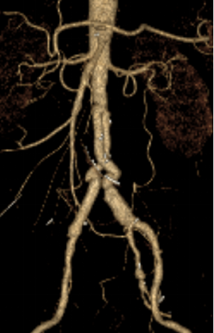 接下来,医生们对多支腰动脉进行了缝扎止血,彻底清理了残余感染灶。随后将组合血管主干与肾下腹主动脉残端进行吻合,两个分支分别与双侧髂总动脉完成端端吻合,重建腹主动脉。术后两天,黄老伯转回了血管外科病房。术后一个月复查动脉CTA显示,股浅静脉组合血管与腹主动脉及髂动脉匹配良好,后腹膜没有异常渗出,手术效果令人满意。